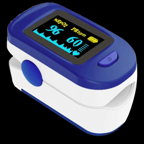 OLED display, measures SpO2 and pulse rate, AAA battery powered, portable, suitable for home/hospital use.