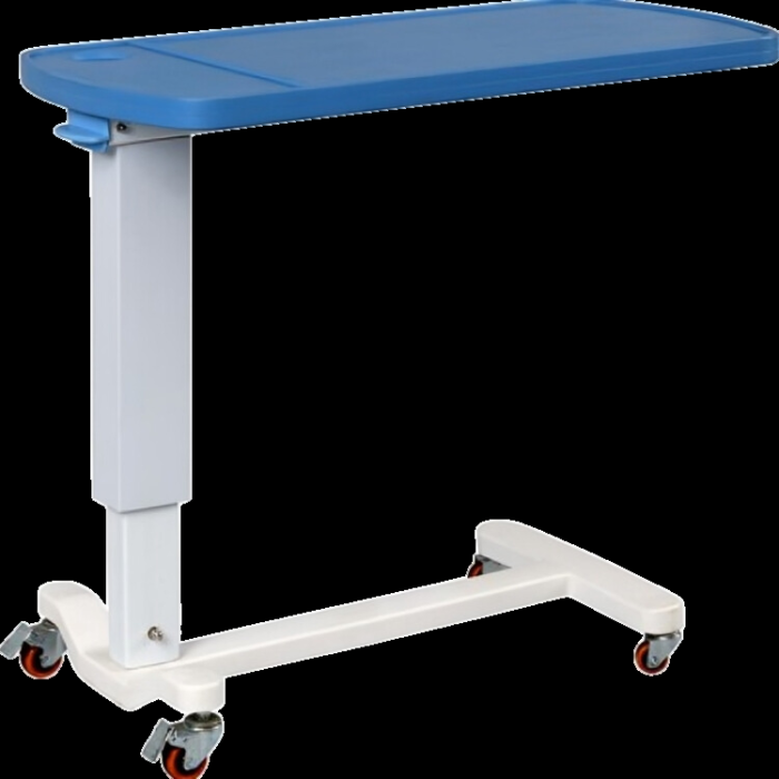 Adjustable over-bed table with hydraulic rod, ABS top, 70-105 cm height range, 1-year warranty.