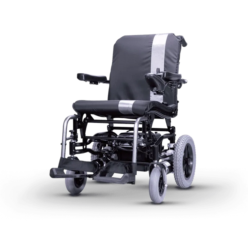 Foldable powered wheelchair with aluminium frame and lead‑acid battery option.