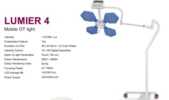 Technical: Intensity 1,40,000 Lux, Depth: 150 mm, CRI: 93 Ra, Life: >50,000 hrs, Power: 220V/50Hz AC.